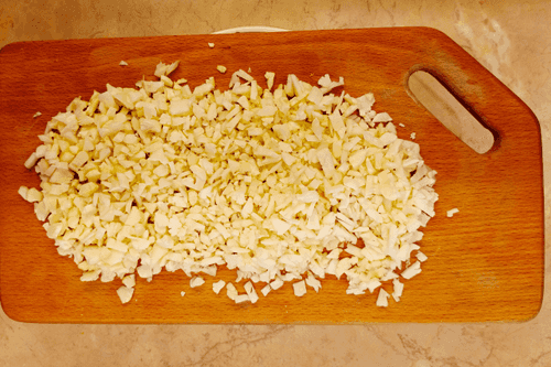 Boil the eggs, peel them, and cut into cubes.
