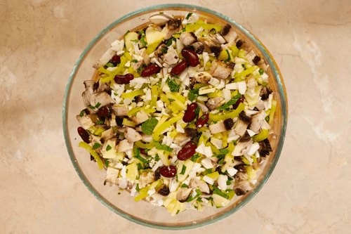 In a deep dish, mix the pepper, cabbage, eggs, apples, beans, and mushrooms.
