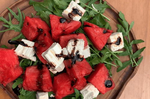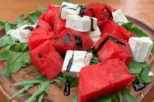 Prepare arugula and place it as a base on the plate. Top it with warm pieces of watermelon and feta cheese. Drizzle a little balsamic sauce on top.