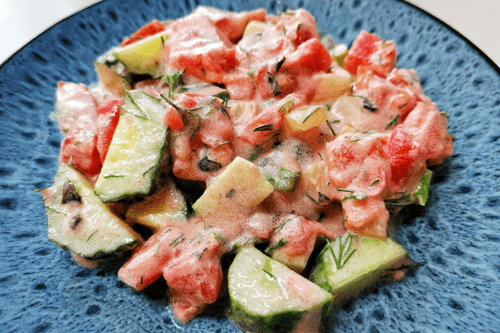 Овощной салат со сметаной – это традиционное блюдо русской кухни, которое сочетает в себе свежесть и насыщенный вкус летних овощей. Яркие помидоры, хрустящие огурцы, сочный сладкий перец и ароматные травы создают гармоничное сочетание, а сметанная заправка придаёт нежную сливочность. Такой салат прекрасно подходит к любым мясным или рыбным блюдам, а также хорош сам по себе в жаркий день. Истоки рецепта уходят в деревенскую кухню, где простые и натуральные продукты использовались в приготовлении сытных и полезных блюд. Вкус салата балансирует между сладостью овощей, лёгкой кислинкой сметаны и пикантностью зелени, делая его универсальным и аппетитным выбором для повседневных и праздничных столов.