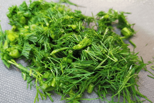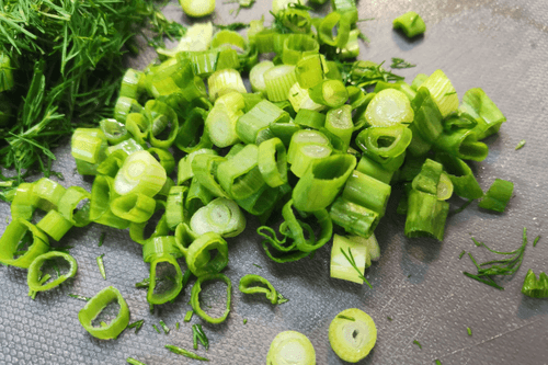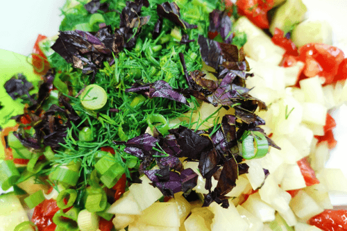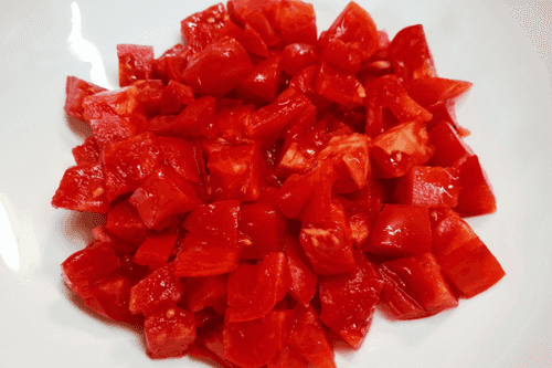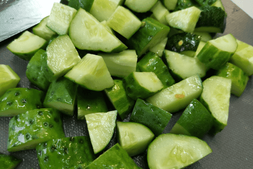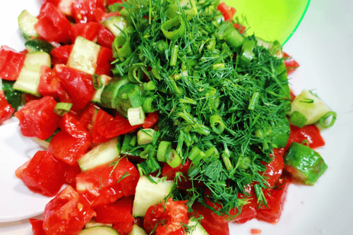Put the chopped tomatoes and cucumbers in a salad bowl and add salt.