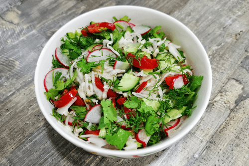 Салат из квашеной капусты и сезонных овощей – это гармония свежести и легкой кислинки, рожденная сочетанием ферментированных и хрустящих ингредиентов. Квашеная капуста, один из древнейших способов сохранения овощей, обогащает блюдо приятной пикантностью, а свежие томаты, редис и огурцы добавляют яркость и сочность. Зелень – кинза и укроп – вносит ароматную свежесть, а чеснок придает легкую пикантную нотку. Заправленный подсолнечным маслом, этот салат не только вкусен, но и полезен благодаря богатству витаминов и пробиотиков. Его можно подавать как самостоятельное блюдо или как освежающий гарнир к мясу и рыбе, а также использовать в качестве легкой закуски, пробуждающей аппетит. Отличный выбор для тех, кто ценит натуральные и сбалансированные вкусы!