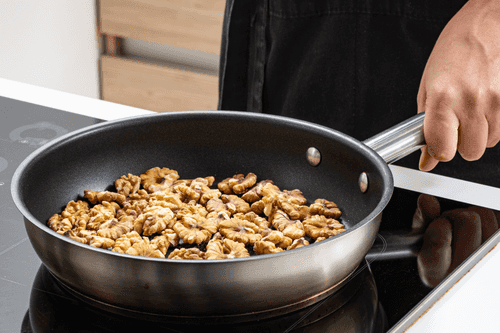 Dry the nuts in a pan and chop them.