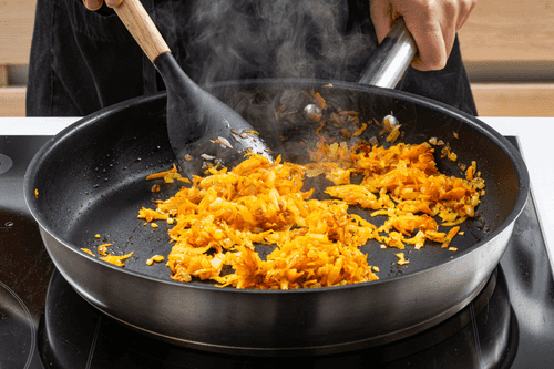 Fry the onion and carrot in vegetable oil until golden brown.