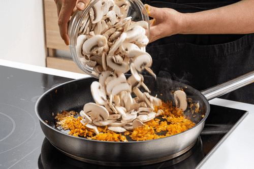 Place sliced mushrooms in the pan and fry until they lose excess moisture and become golden.