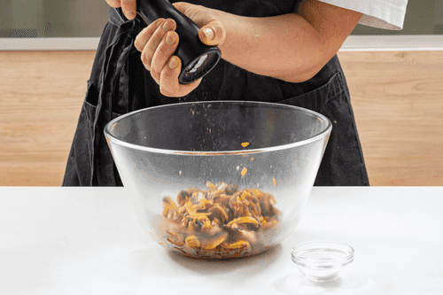Salt and pepper the mushrooms and transfer them to a salad bowl.