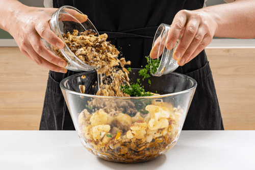 Теплый салат из жареных грибов с цветной капустой — это оригинальное блюдо, которое сочетает в себе нежность и хрусткость, создавая неповторимый вкус. Цветная капуста, панированная и обжаренная до золотистой корочки, придает салату выразительный текстурный контраст. Грибы, пропитанные ароматами специй и масла, дополняют композицию мягкой глубиной вкуса. Грецкие орехи добавляют пикантные, насыщенные нотки. Вкус блюда оживляет заправка из соевого соуса, горчицы и чеснока, которая соединяет все ингредиенты в гармоничном ансамбле. Это салат, который идеально подходит как самостоятельное блюдо, так и как оригинальная закуска для особых случаев. Его можно подавать теплым, наслаждаясь всеми оттенками вкуса, раскрывающимися в каждом кусочке.