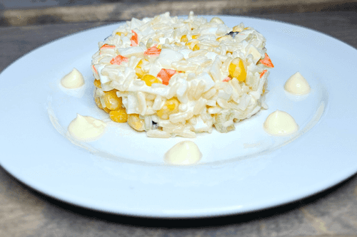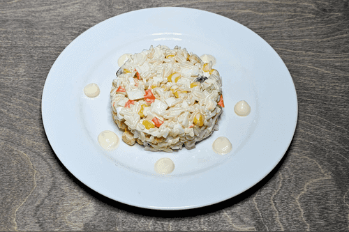 Крабовый салат с кукурузой и яйцом — это яркое сочетание нежного крабового мяса, сладкой кукурузы и сливочного вкуса вареных яиц, дополненное свежестью огурца и пикантностью лука. Это блюдо стало популярным в России в конце XX века, когда крабовые палочки вошли в обиход как доступная альтернатива морепродуктам. Салат известен своей простотой и универсальностью — он идеально подходит как для праздничного застолья, так и для повседневного ужина. Ароматный рис добавляет текстурную глубину, а майонез связывает все компоненты в гармоничный ансамбль вкусов. Подают его охлажденным, что делает его особенно освежающим в жаркие дни. Это классика русской кухни, которая всегда остается актуальной!