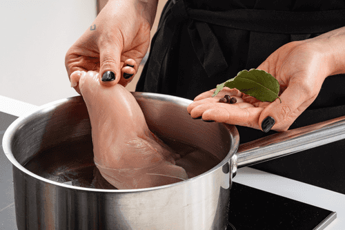 Place the chicken breast in cold water. Add bay leaf and allspice, and bring to a boil.