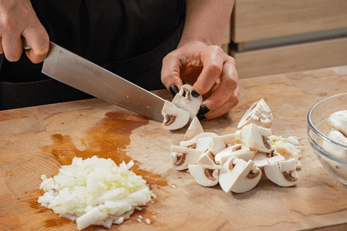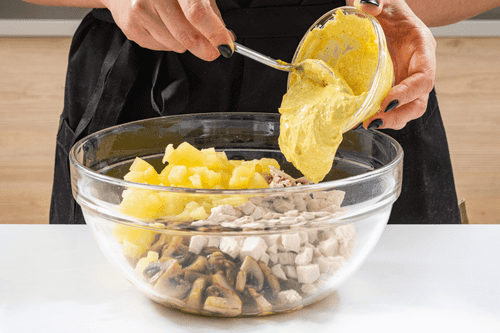 Mix chicken, mushrooms with onion, and pineapple. Season with mayonnaise mixed with curry. Add salt to taste and stir.