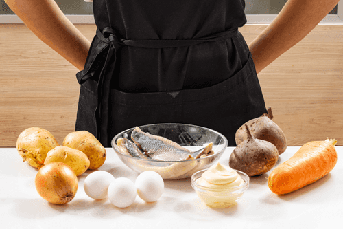 Place half of the potatoes at the bottom of the plate. Then layer herring, onion, eggs, carrot, and the remaining potatoes.