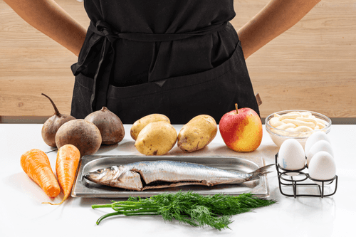 Layer the salad on a plate. The recommended order of ingredients is: potatoes, herring, apples, eggs, carrots. Top it off with beets.