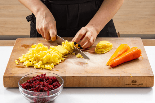 Cut the carrot and potato into small cubes, and grate the beetroot on a fine grater.