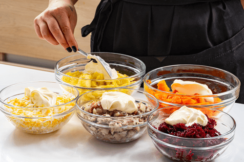 Place potatoes, carrots, beets, herring, and eggs in separate bowls, mix with mayonnaise, and salt if necessary.
