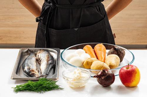 Place half of the potatoes at the bottom of the plate. Then layer with herring, onion, apple, remaining potatoes, eggs, and carrot.
