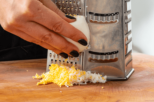 Grate the eggs on a fine grater.