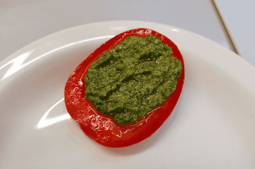 Place a slice of tomato with pesto. Continue according to the aforementioned scheme.