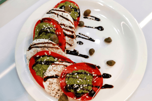 Caprese salad with capers is a delightful Italian dish that combines simplicity and sophistication. The classic caprese, named after the island of Capri, is famous for its harmony of fresh tomatoes, tender mozzarella, and fragrant basil. In this version, its flavor is enriched with tangy capers that add a light salty sharpness, while pesto and balsamic cream provide depth of taste. Thin layers of tomatoes and cheese alternate to create an elegant composition on the plate. The delicate, creamy taste of mozzarella perfectly complements the sweet-sour notes of balsamic cream, while sesame adds a light crunchy texture. Caprese salad with capers is the perfect dish for a summer dinner, appetizer or light snack that embodies the best traditions of Mediterranean cuisine.