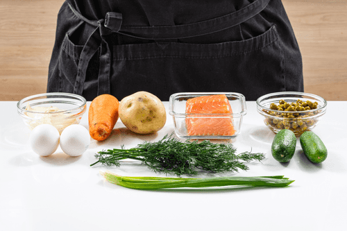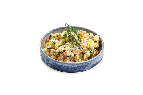 Оливье с красной рыбой — изысканный вариант классического русского салата, корни которого уходят в XIX век. Изначально созданный шеф-поваром Люсьеном Оливье, этот салат пережил множество изменений, но неизменно остается любимцем праздничного стола. В этом варианте традиционное мясо заменено слабосоленой семгой, что придает блюду утонченность и благородный вкус. Нежность картофеля и моркови, свежесть огурцов, легкая солоноватость рыбы и сливочность яиц гармонично сочетаются с пикантностью укропа и зеленого лука. Консервированный зеленый горошек добавляет мягкости, а майонез связывает все ингредиенты в единую композицию. Оливье с красной рыбой — это не просто салат, а настоящий гастрономический шедевр, который идеально подходит для торжеств, поражая гостей своим утонченным вкусом и элегантной подачей.