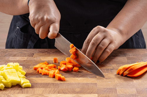 Peel the potatoes and carrots, and cut them into cubes about 1 cm on each side.