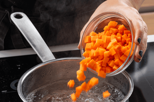 Bring water to a boil in a pot and add carrot cubes. Cook for 2 minutes.