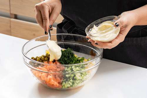 Mix all prepared ingredients, including peas, with mayonnaise, and salt if needed.