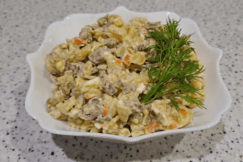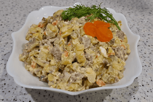 Оливье с говядиной и морковью – это изысканный вариант классического салата, который по праву считается символом праздничного застолья. Родившись во французской кухне XIX века благодаря шеф-повару Люсьену Оливье, он приобрел невероятную популярность в России и других странах. В этом варианте нежная отварная говядина придает блюду насыщенный мясной вкус, а сочная морковь добавляет сладковатые ноты. Хрустящие маринованные огурцы и зеленый горошек гармонично дополняют вкусовую палитру, а майонез объединяет все ингредиенты в единую кремовую текстуру. Этот салат идеально подходит для торжественных ужинов и семейных встреч, даря насыщенные, но сбалансированные вкусовые ощущения. Подается охлажденным, украшенным свежим укропом, который подчеркивает его свежесть и аппетитность.