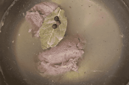 Wash the beef well under running water, place it in a pot, cover with water, bring to a boil, skim off the foam, add 1 bay leaf and 3 peppercorns, salt to taste, and boil until cooked over medium heat. Cool in the broth.