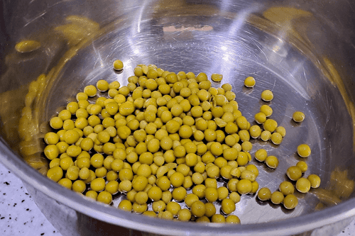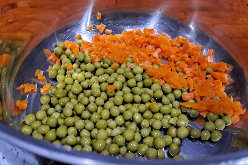 Peel the boiled carrot, cut it into small cubes, and place it in a container with green peas.