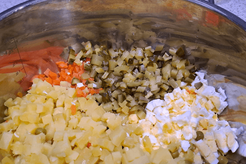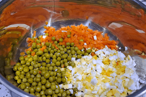 Chop the pickled cucumbers into small cubes and place them in a container with green peas, carrots, eggs, and potatoes.