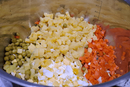 Peel the potatoes, cut them into small cubes, and place them in a container with green peas, carrots, and eggs.