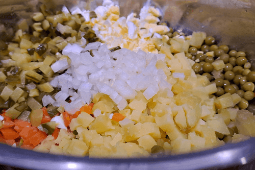 Peel the onion, chop it into small cubes, and place it in a container with green peas, carrots, eggs, potatoes, and cucumbers.
