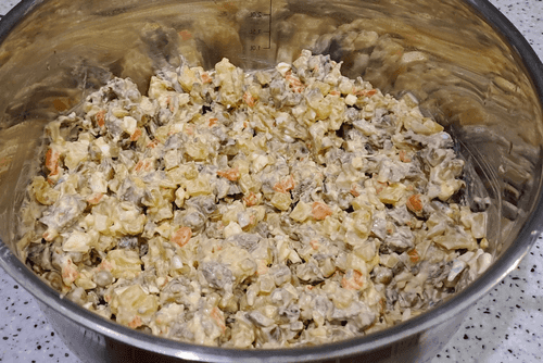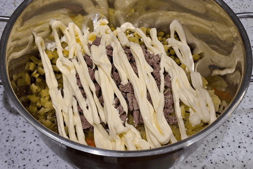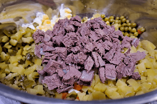 Cut the boiled beef into small cubes and place it in a container with the prepared ingredients.