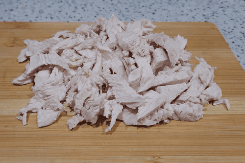 Boil the chicken breast in salted water, cool it in the broth. Cut into medium-sized cubes or strips.