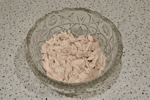 A deep salad bowl is suitable for forming the salad. Place chopped chicken breast at the bottom, press it down a bit with a spoon, and spread mayonnaise on top.
