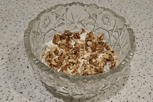 Spread grated cheese over the nuts and lightly press it down with a spoon.