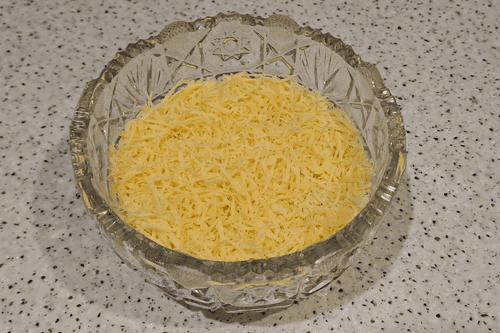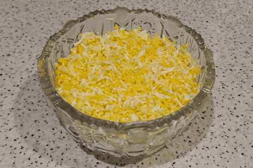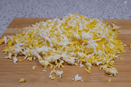 Layer grated chicken eggs in the salad bowl and spread with mayonnaise.