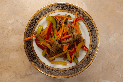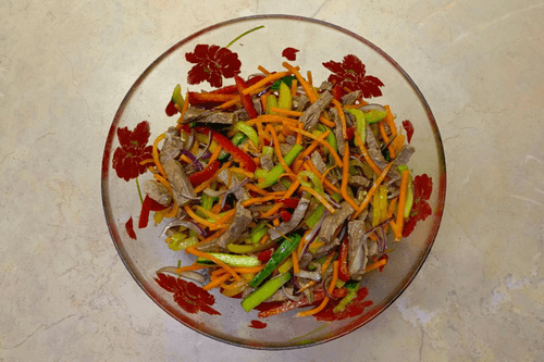 Asian-style salad with beef and vegetables is a harmony of vibrant flavors and textures inspired by the traditions of Pan-Asian cuisine. The combination of juicy boiled beef with crunchy fresh vegetables, aromatic garlic, and spicy soy sauce creates a rich and balanced taste. This dish reflects motifs from Korean and Chinese recipes, where the freshness of ingredients and a zesty dressing are essential. The oil heated before adding to the salad adds a special depth of flavor, while marinating makes it even richer. Such a salad is an excellent choice for a festive table or dinner when you want to enjoy the rich and multifaceted taste of Asian cuisine. It can be served as a standalone dish or as a side to main meat dishes.