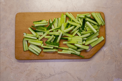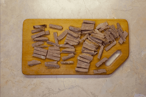 Boil the beef the day before, cool it in the broth, cut it into strips, and place it in a salad bowl.