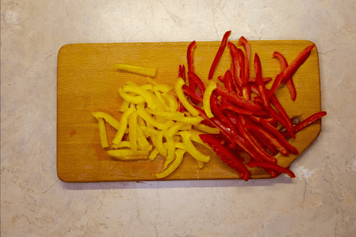 Remove seeds and partitions from the pepper, cut into strips, and add to the salad bowl.