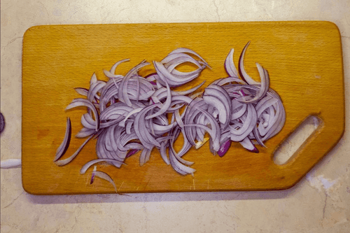 Peel the onion, cut it in half, slice it into thin feathers, and add to the salad bowl.