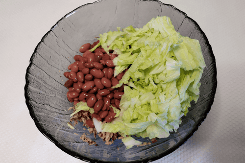 Add chopped cabbage and canned beans to the bowl with tuna.