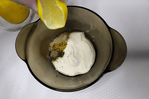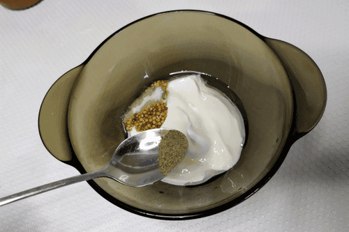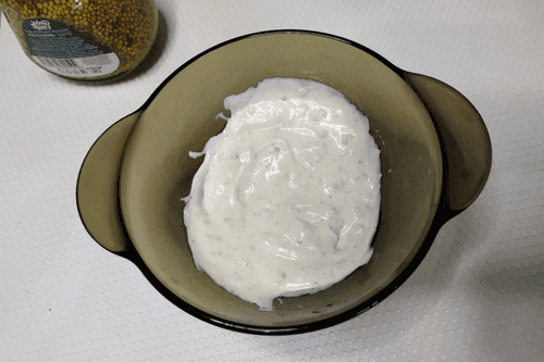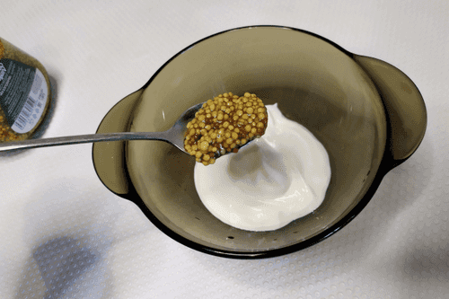 Add 1 teaspoon of Dijon mustard to the Greek yogurt.