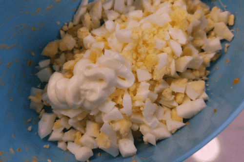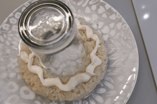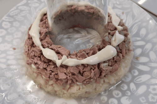 Form a ring shape from cabbage using a glass in the center. Layer mayonnaise on top.