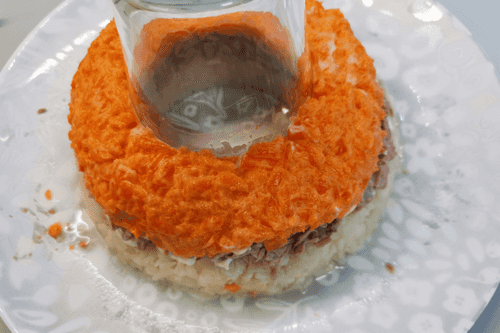 Grate the carrot on a coarse grater and mix it with mayonnaise.