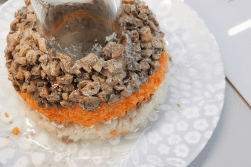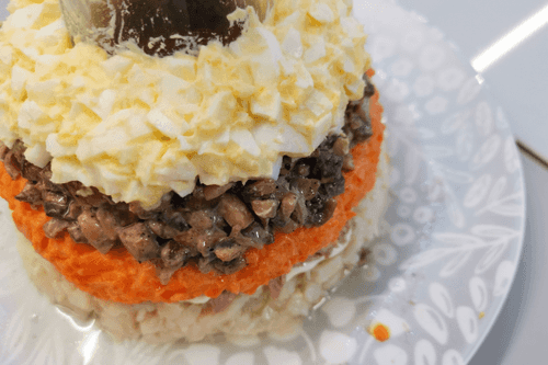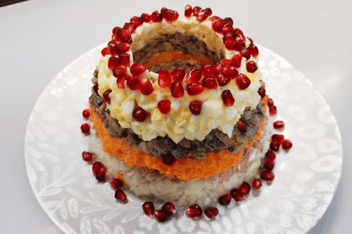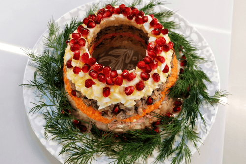 The 'Pomegranate Bracelet' salad is not just an appetizer but a true culinary masterpiece symbolizing luxury and celebration. Its name is linked to its shape resembling an elegant bracelet adorned with ruby pomegranate seeds. This salad combines the tenderness of turkey, the juiciness of vegetables, and a savory hint of mushrooms, creating an amazing flavor richness. Cream cheese adds creaminess while mayonnaise binds the ingredients into a harmonious whole. Pomegranate seeds add brightness and a slight tanginess that refreshes the taste. Perfect for festive tables, this salad impresses not only with its flavor but also with its appearance, becoming the centerpiece of any feast.