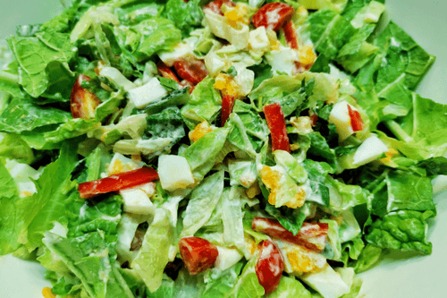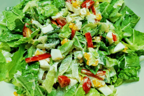 Egg salad is a fresh and light European salad that combines crunchy vegetables with tender boiled eggs. Its roots trace back to traditional home kitchens where simple and accessible ingredients create a harmonious flavor. Sweet cherry tomatoes, refreshing cucumbers, and ramiro peppers add brightness to the salad, while napa cabbage and iceberg lettuce provide a crunchy texture. Boiled eggs contribute softness and richness, while the dressing of sour cream and mayonnaise unites all flavors into a cohesive composition. This salad is perfect as a standalone dish or as a side to meat and fish due to its balance and freshness. It can be served at family dinners or on festive occasions, enjoying its lightness and nutritional value.