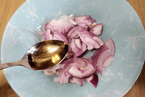 Slice the red onion into thin half-rings and let it sit in apple vinegar for 15 minutes.