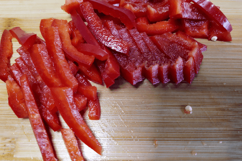 Cut the red sweet pepper into strips.