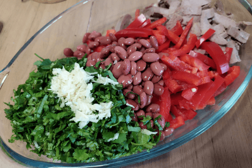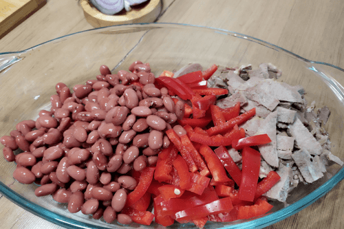 Place the tongue, pepper, and red canned beans in the dish. First, drain the excess liquid from it.